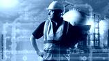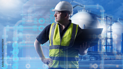 Man factory technologist. Manufacturing engineer with laptop. Engineer near spherical oil storage. Design of gas processing station. Man with laptop near industrial enterprise. Design of factory