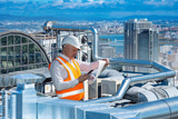 Man servicing ventilation communications stands on roof. Air handling unit designer. Men on roof with conditioning ducts. Foreman with drawings among pipes industrial utilities. Ventilation system