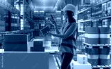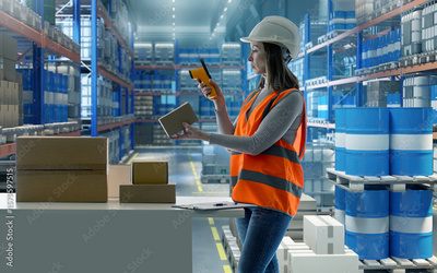 Female warehouse worker scanning box barcode with handheld scanner, safety gear, inventory management, logistics, quality check – Warehouse.