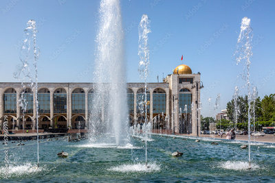 Fountains at Ala-Too Square in the center of Bishkek, Kyrgyzstan during summer sunny day.