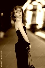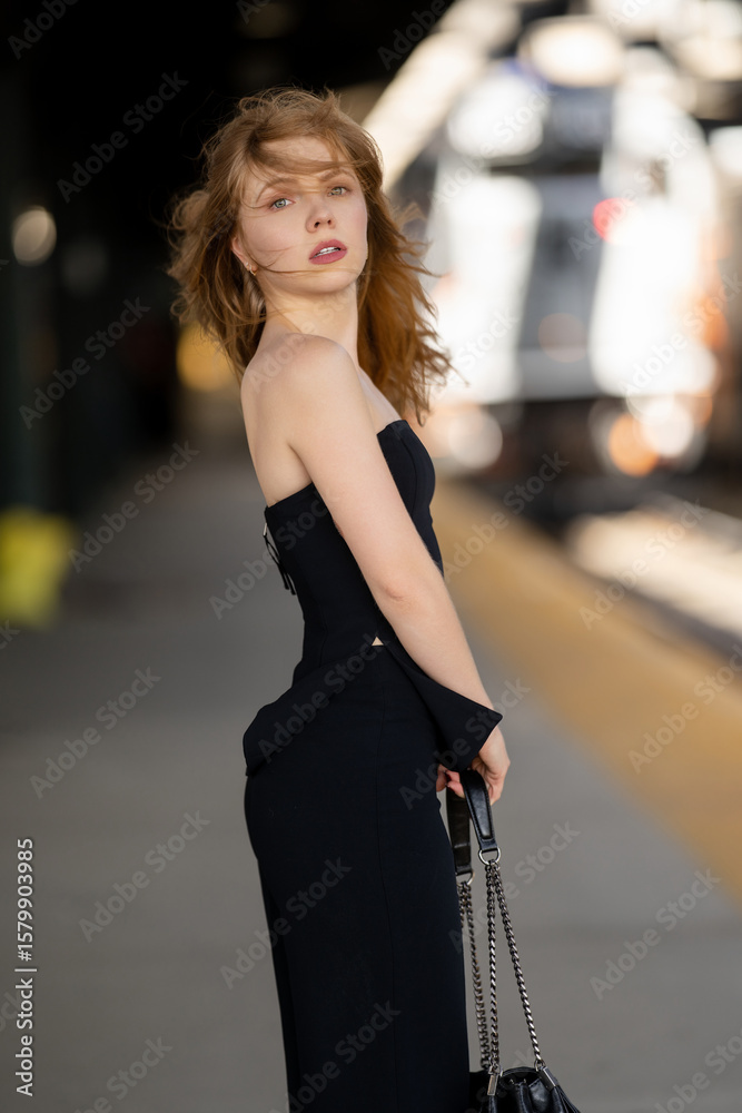 Attractive woman standing by the train wagon. Trendy girl exploring the city by rail. Elegant lady at the railway station. Sexy girl in fashionable outfit on the go. Summer holiday.