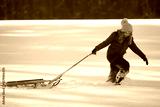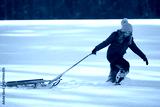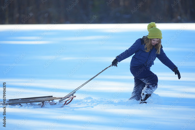 Kid boy play in the snow with a winter hat. Happy kid in warm clothes enjoying snow falling. Kid playing in snowy park. Child play with snow outdoors during first snowfall. Winter activities for kids.