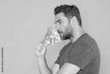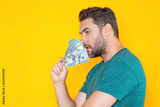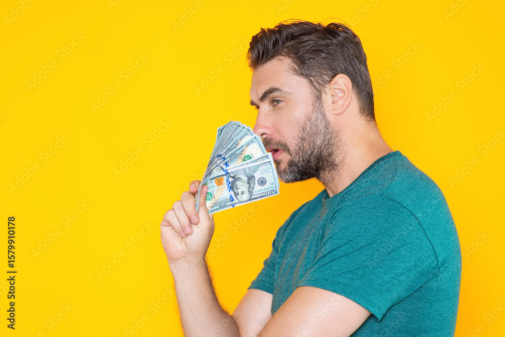 Man with money cash. Dollar banknotes. Portrait of man holding bunch of money banknotes. Dollar bills, credit, online banking. Rich man pointing at dollar banknotes, bank loan, financial savings.