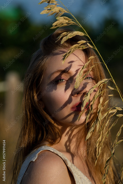 Closeup portrait of a beautiful young woman. Girl posing outdoors in summer light. Natural beauty woman. Female woman face. Pretty face with soft skin. Fashion woman.