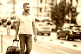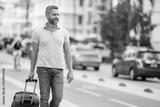 A tourist with suitcase walks through the streets. A man tourist enjoys his summer vacation in a tropical city. A traveler tourist with suitcase explores an urban landscape. Man tourist walk on city.