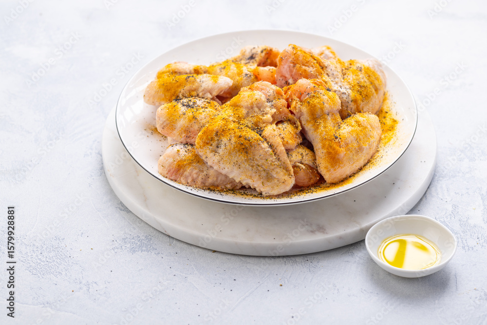 Raw chicken wings, with dry rub and olive oil prepared for bbq