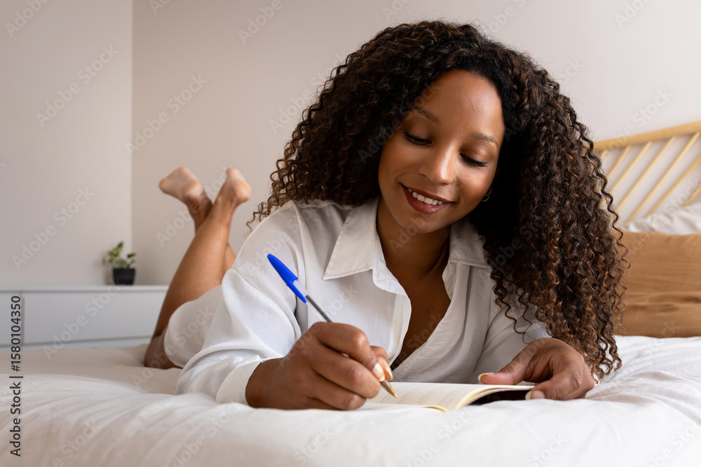 Pensive happy African American woman lying down on bed writing in personal journal in bedroom.