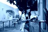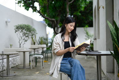 Relaxed young woman reading a book alone at an outdoor cafe