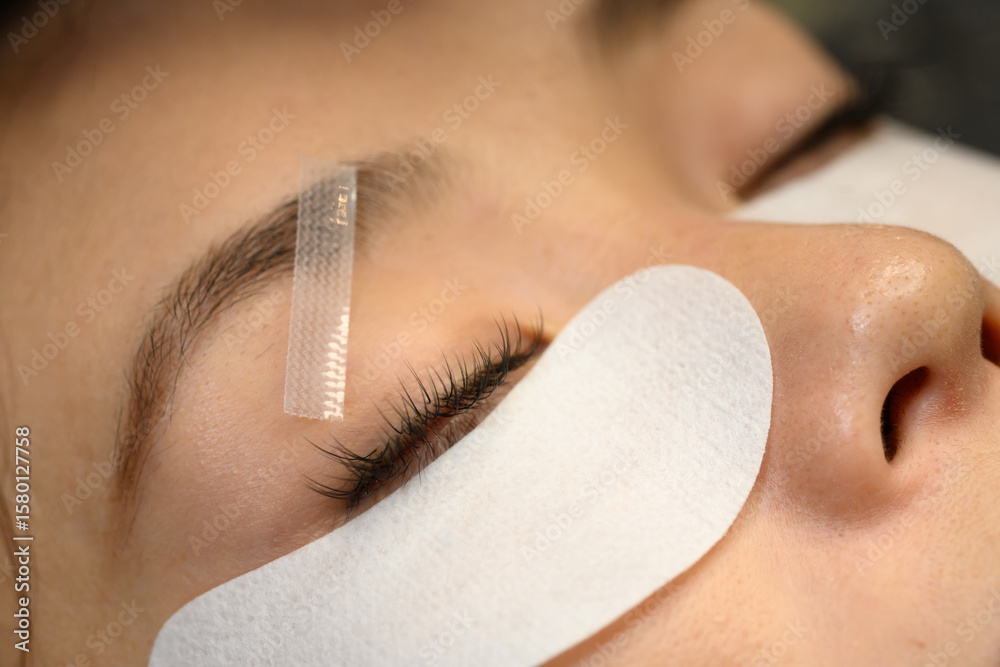 Female client closed eye with under eye pads in place during an eyelash extension procedure
