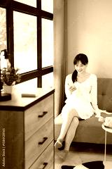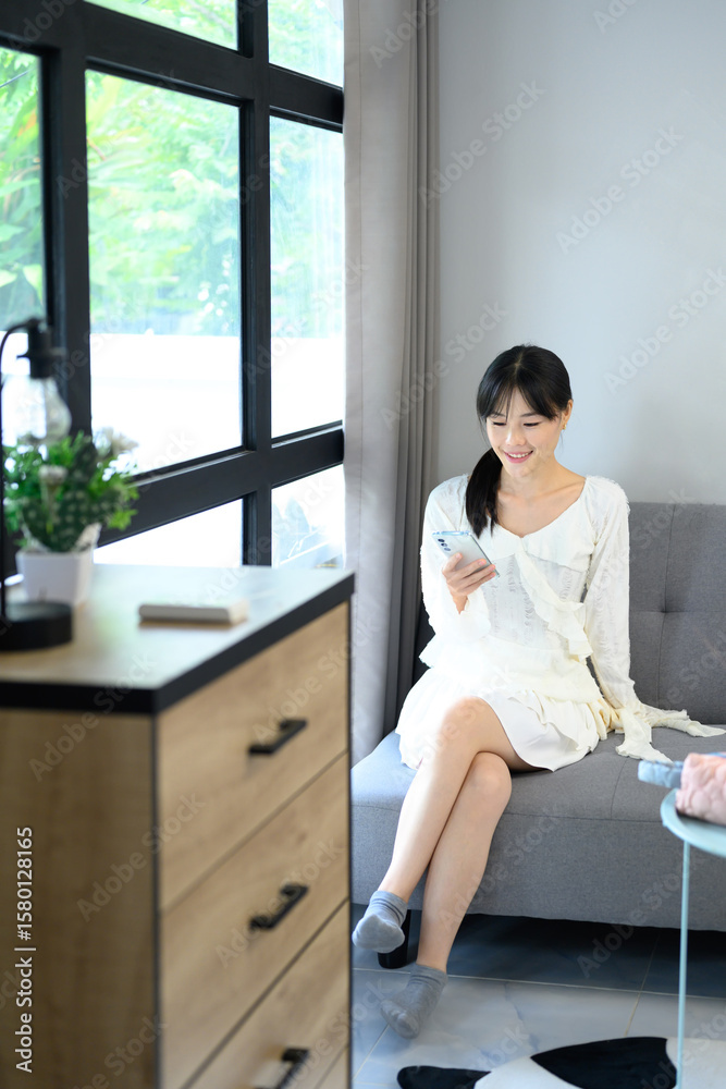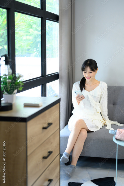 Asian woman in a white dress sitting on a sofa and using a smartphone