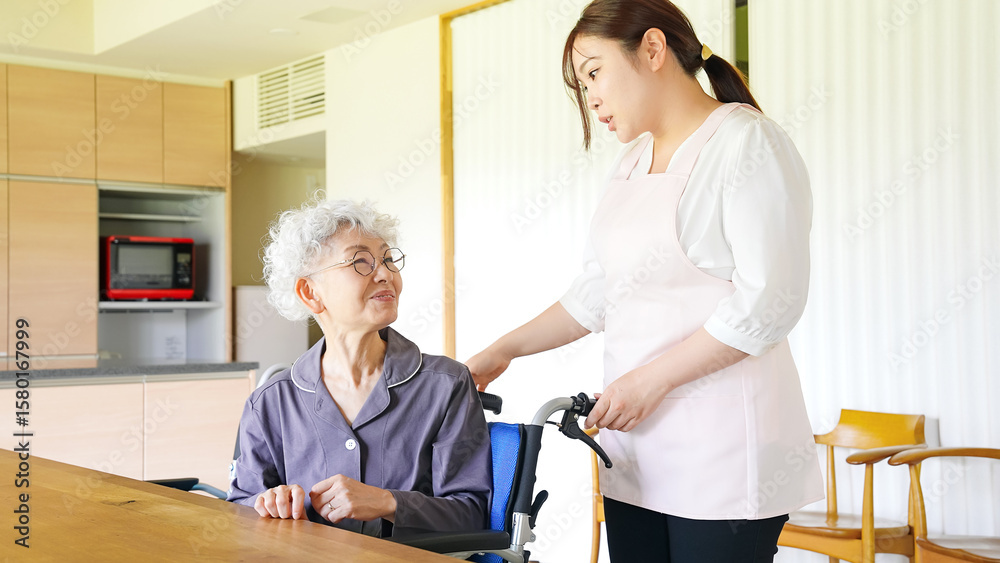 ケアスタッフからサポートを受ける車椅子に乗ったシニア女性