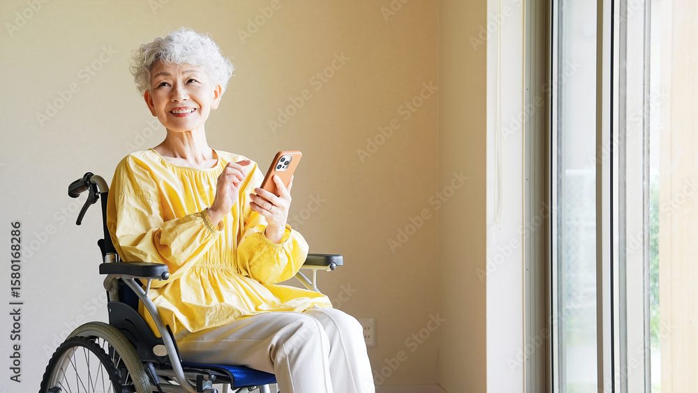 シニア、スマホ、スマートフォン、障害者、車椅子、女性、アプリ、車いす、高齢者、お年寄り、バリアフリー、情報、ニュース、マップ、検索、SNS、ソーシャルメディア、調べる、イベント、おばあちゃん、シルバー、保険、申し込み、手続き、電子化、DX、デジタル、メール、メッセージ、チャット、笑顔、介護、連絡、見守り、便利、機能、デイサービス、サポート、支援、タッチ、操作、日本人、60代、70代、福祉、施設、老
