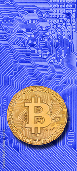 Eine Münze Bitcoin Kryptowährung liegt auf einem digitalen Netzwerk - FOTOMONTAGE
