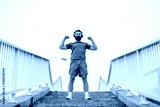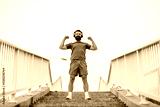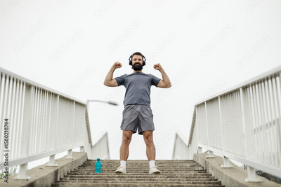 Full length of fit sportsman in shape standing on stairs and flexing muscles while looking at the camera.