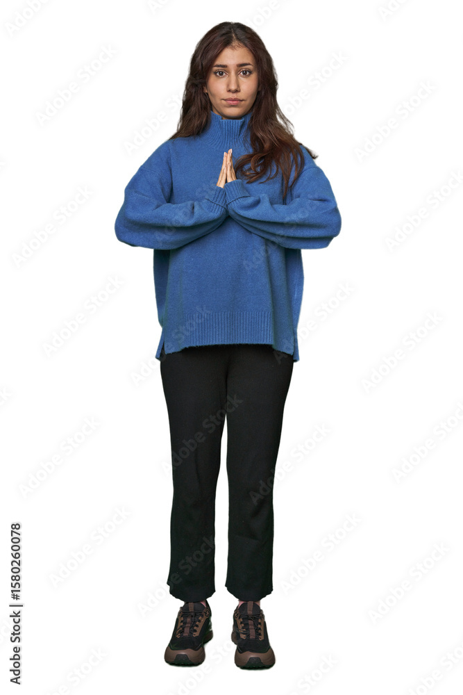 Middle Eastern woman, full body studio praying, showing devotion, religious person looking for divine inspiration.