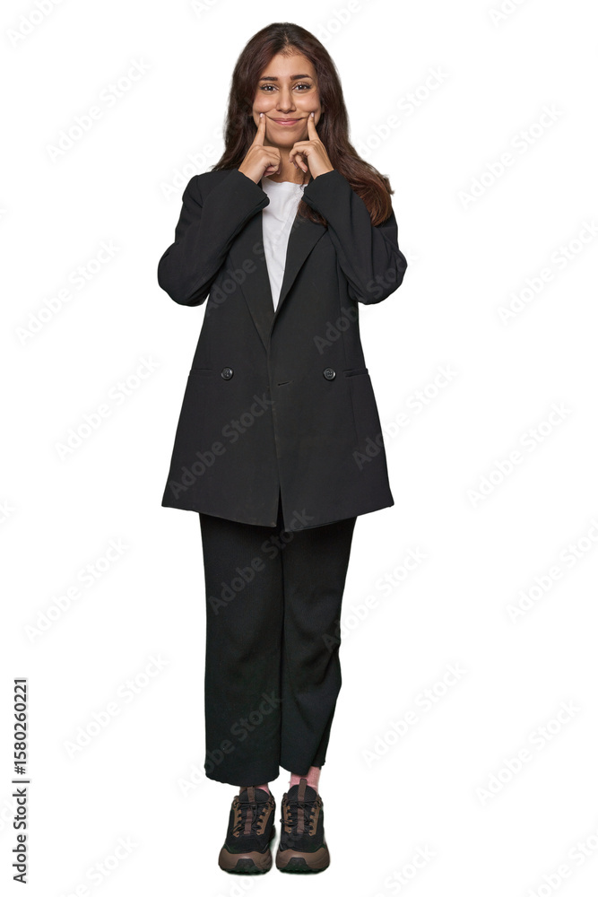 Middle Eastern in business attire smiles, pointing fingers at mouth.