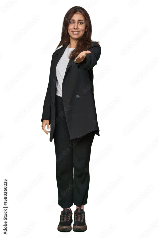 Middle Eastern in business attire stretching hand at camera in greeting gesture.