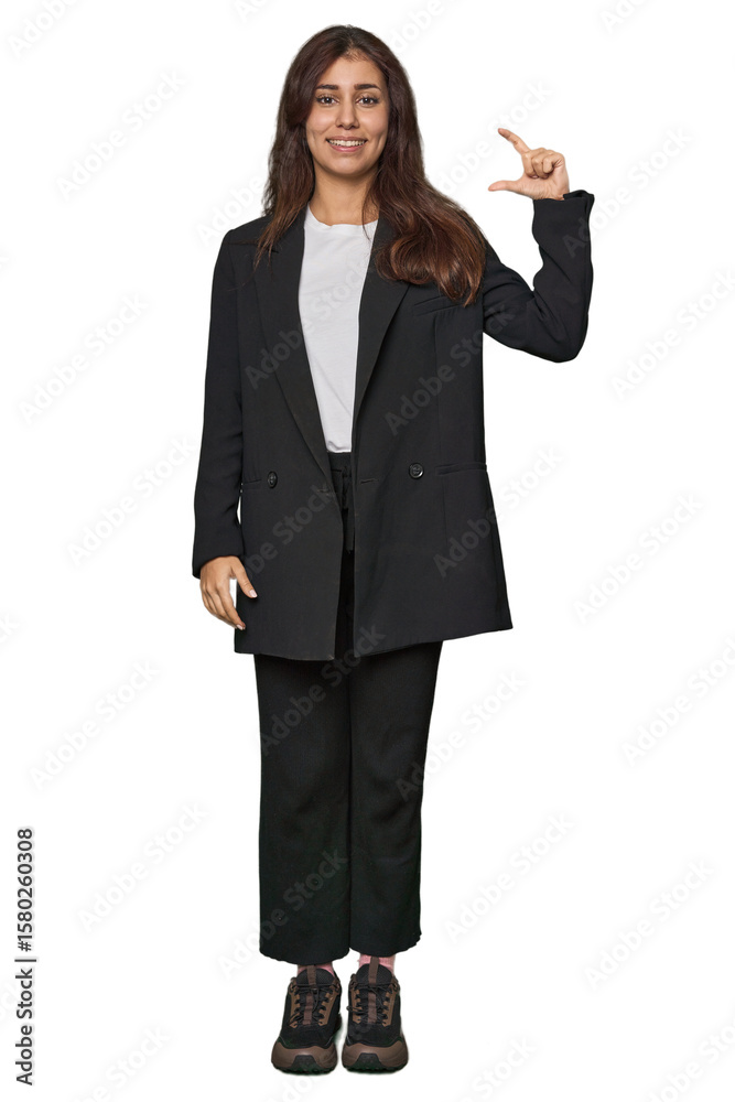 Middle Eastern in business attire holding something little with forefingers, smiling and confident.