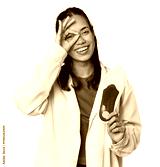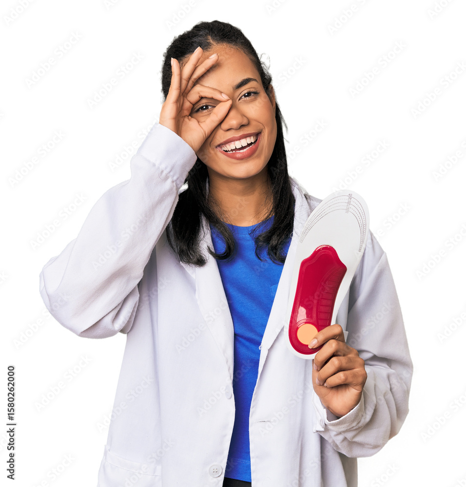 Young Filipina podiatrist with insole excited keeping ok gesture on eye.