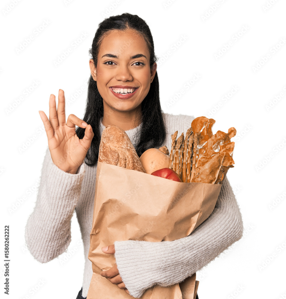 Young Filipina shopping for groceries cheerful and confident showing ok gesture.