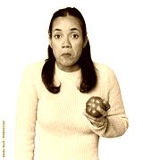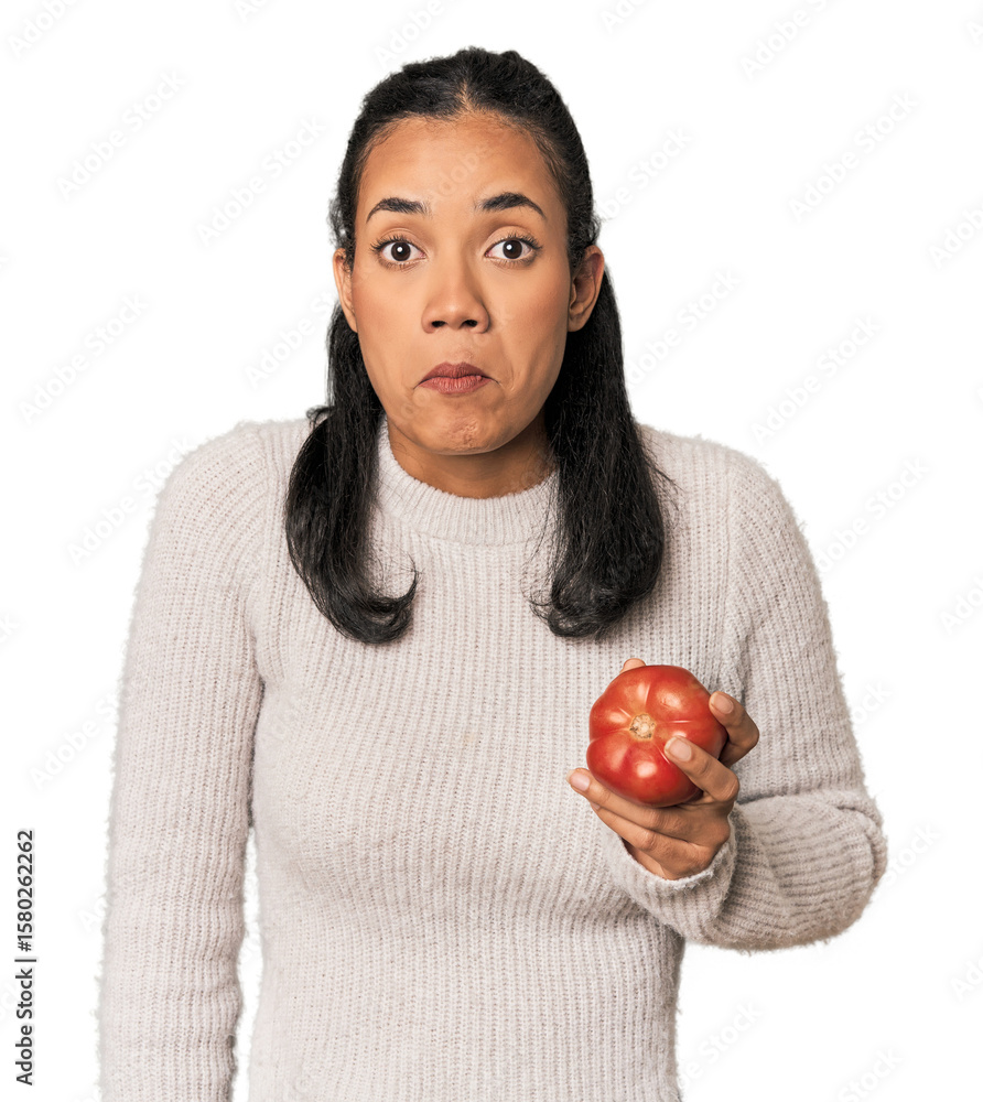 Young Filipina holding a tomato shrugs shoulders and open eyes confused.