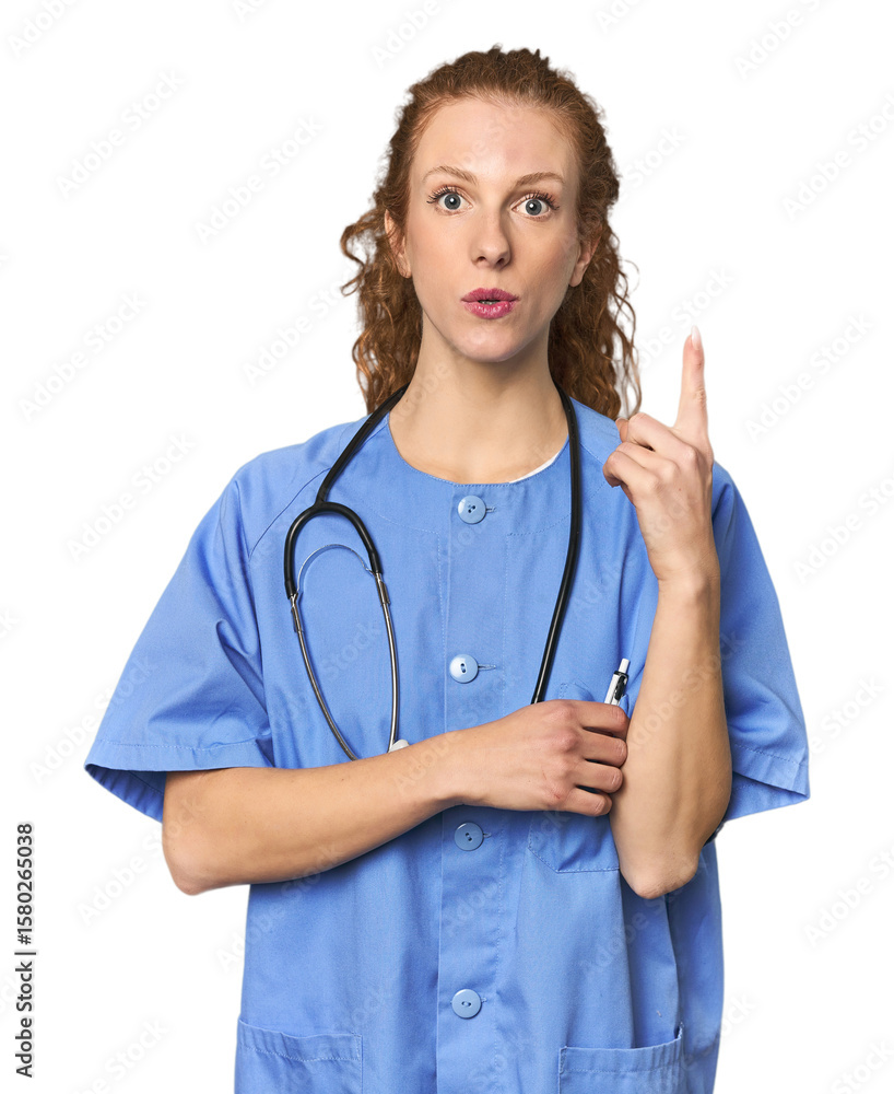 Redhead young caucasian nurse in studio having some great idea, concept of creativity.