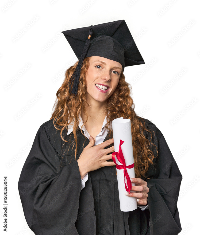Graduate redhead with diploma laughs out loudly keeping hand on chest.