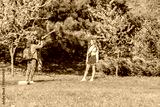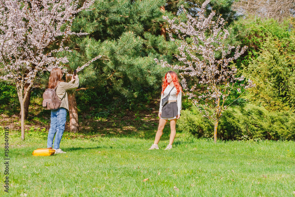 Two young women taking photos among blooming cherry blossom trees in spring park, one posing while other photographs with smartphone creating memorable moments in nature