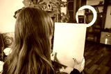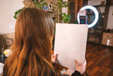 Woman facing away, holding blank canvas before ring light with phone, preparing for online content creation or art session at home. Concept of remote work, creativity, blogging, or e-learning.