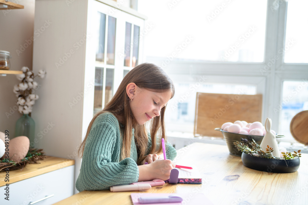 Young girl writing at a table, surrounded by Easter decorations and bathed in bright window light. Cozy home scene.