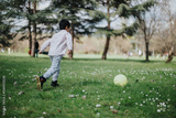 A young boy enjoying outdoor activity in a vibrant park setting, playing with a bright ball, surrounded by green grass and trees, capturing carefree childhood moments.