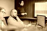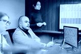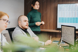 Group of people analyzing stock market trends during a business meeting, featuring charts and teamwork in a modern office atmosphere.