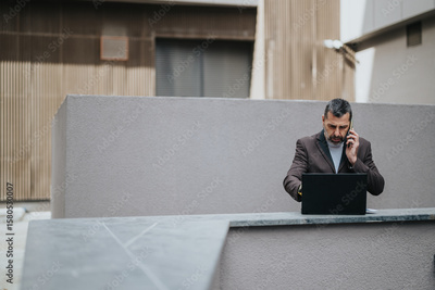Businessman using a laptop and speaking on a phone outdoors, showcasing multitasking and professionalism in a modern urban environment.