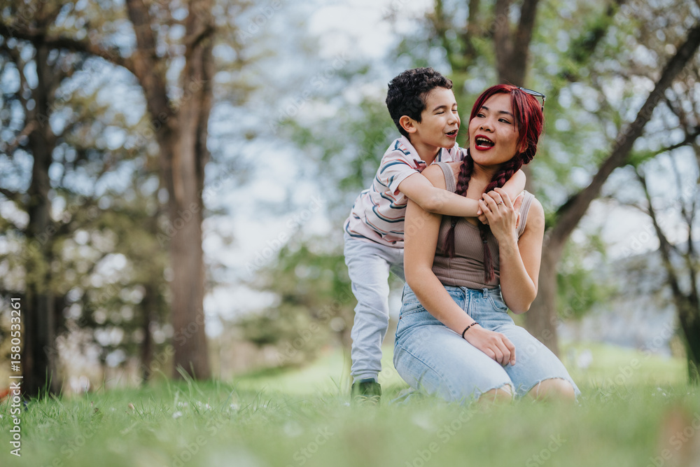 A young Filipino mother smiles happily while her son laughs affectionately hugging her in a serene park setting. The family is enjoying a bonding moment surrounded by nature and green trees.