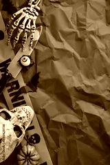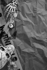 Celebratory Halloween-themed vertical composition featuring spooky elements like skull, skeleton hand, orange accents, bats, and warning tape, ideal for seasonal decorations.