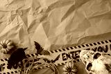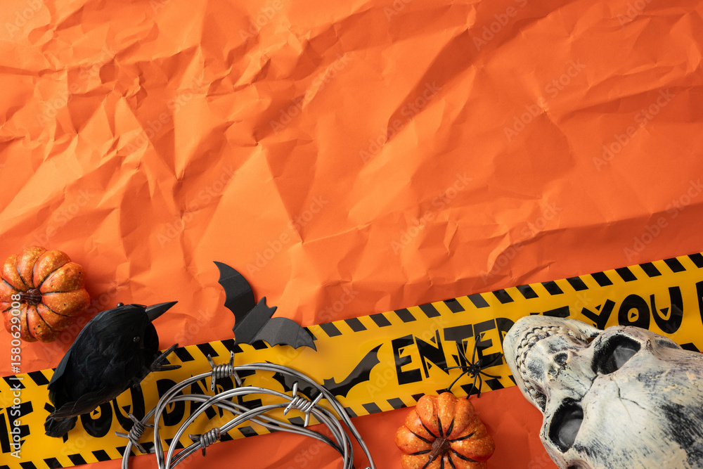 Spooky Halloween arrangement featuring a skull, pumpkins, black bird, and caution tape on a vibrant orange backdrop, creating a festive and eerie atmosphere for seasonal celebrations and decorations