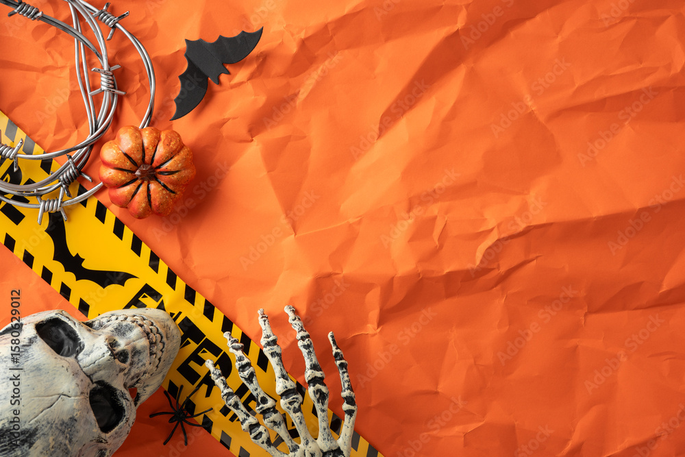 Halloween-themed arrangement with skull, skeleton hand, pumpkin, barbed wire, bats, and orange background