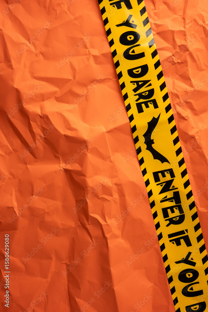 Crushed orange vertical backdrop featuring a yellow warning tape with spooky Halloween message