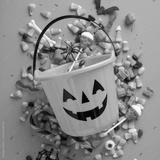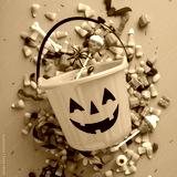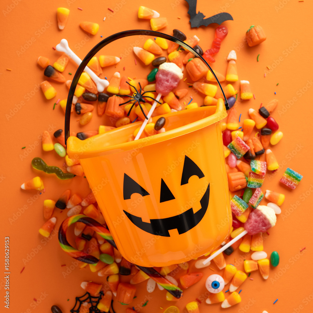 Halloween-themed vertical setup featuring a pumpkin bucket alongside festive candies and seasonal objects