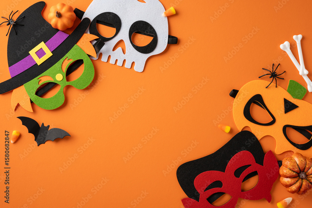 Halloween-themed flat lay featuring colorful masks and vibrant decorations arranged on an orange surface