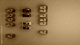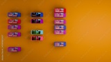 Multiple modular architectural units in various colors on an orange background