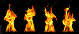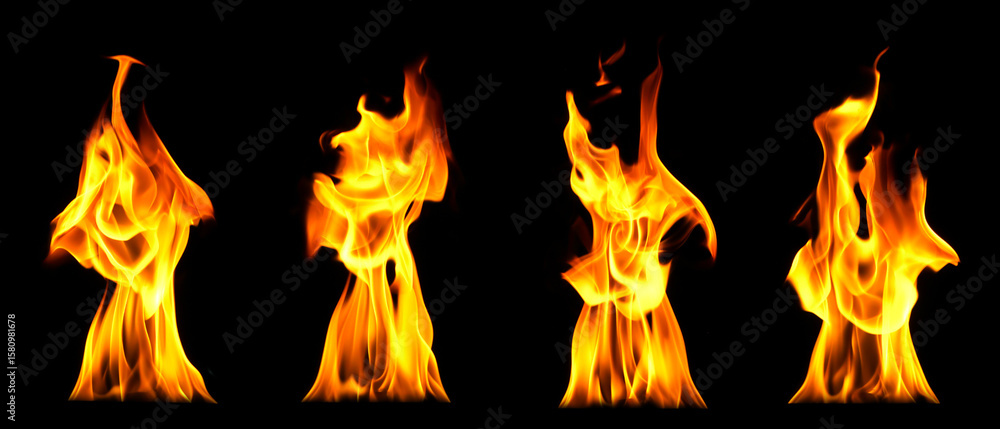 Abstract flames collection isolated on black background. Flames on black background. Concept of burning effect texture. Graphic design. Bonfire. Flames at night. Flame effect with burning fire.