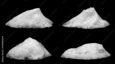 liquid white foam from soap or shampoo or shower gel Abstract soap bubbles. Set foam, soap bubble isolated on black, with clipping path texture and background.