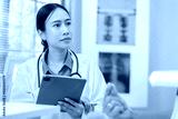 Asian female doctor conducts thorough medical consultation with elderly Caucasian patient, actively listening to mental and physical health concerns. Professional physician takes detailed notes