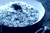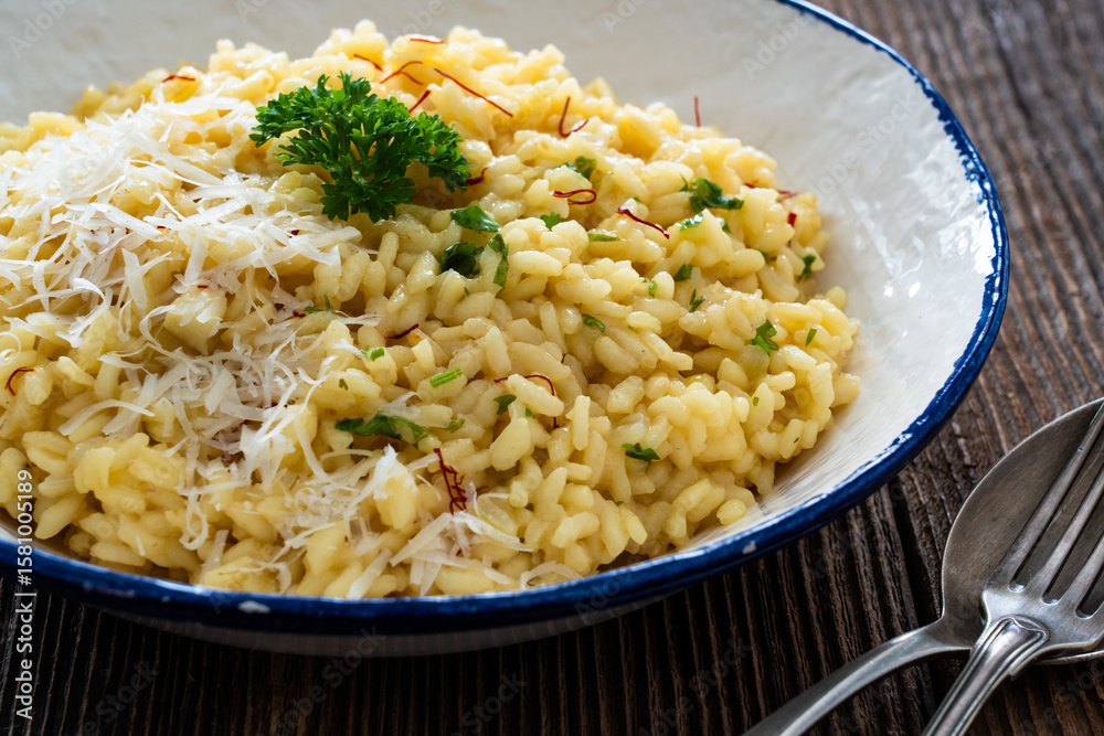Risotto alla Milanese on wooden table. Milanese style risotto - saffron risotto on wooden background