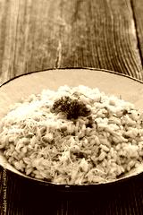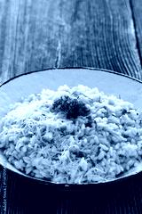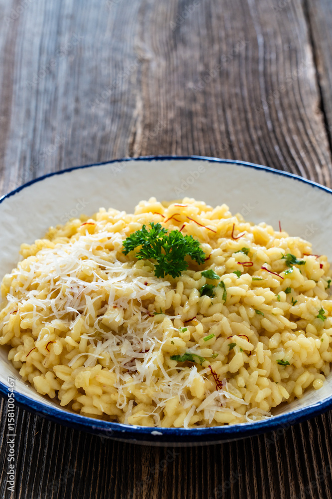 Risotto alla Milanese on wooden table. Milanese style risotto - saffron risotto on wooden background
