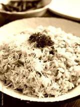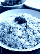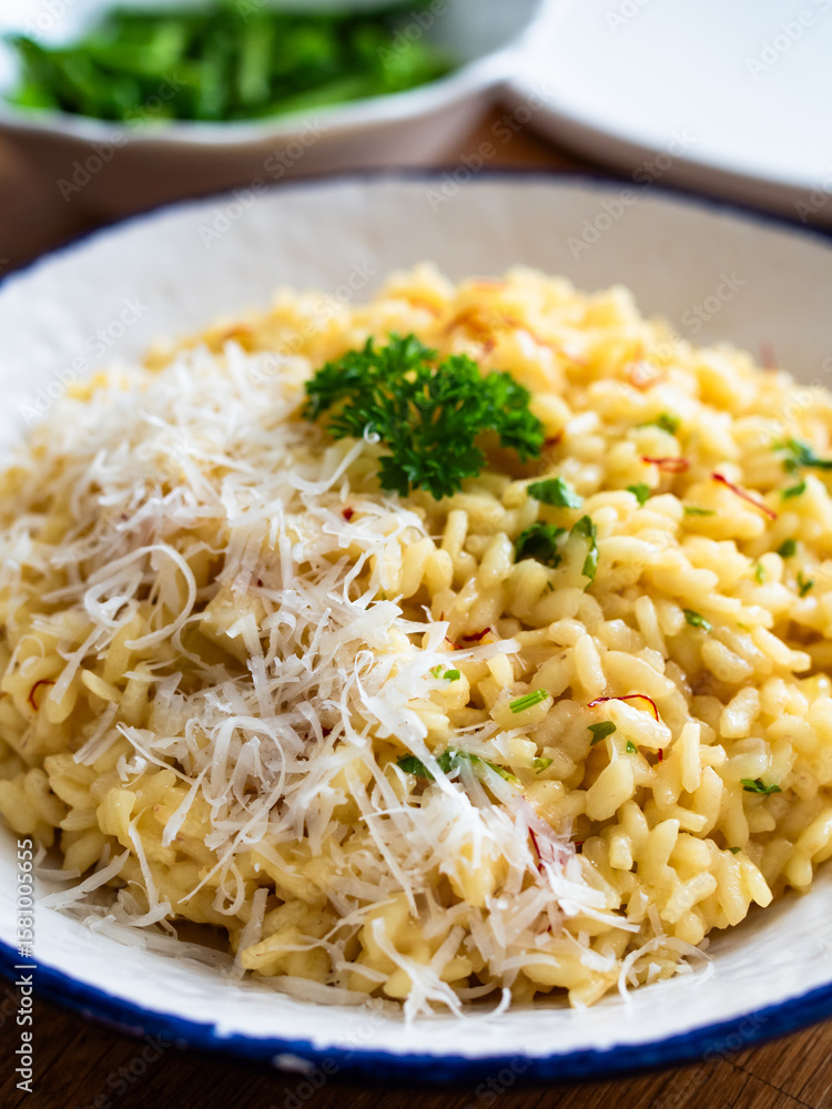 Risotto alla Milanese on wooden table. Milanese style risotto - saffron risotto on wooden background