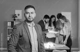 Portrait of a professional businessman looking at camera with a serious expression. Group of business people in background, working as a team in an office. Focus on leadership and teamwork.