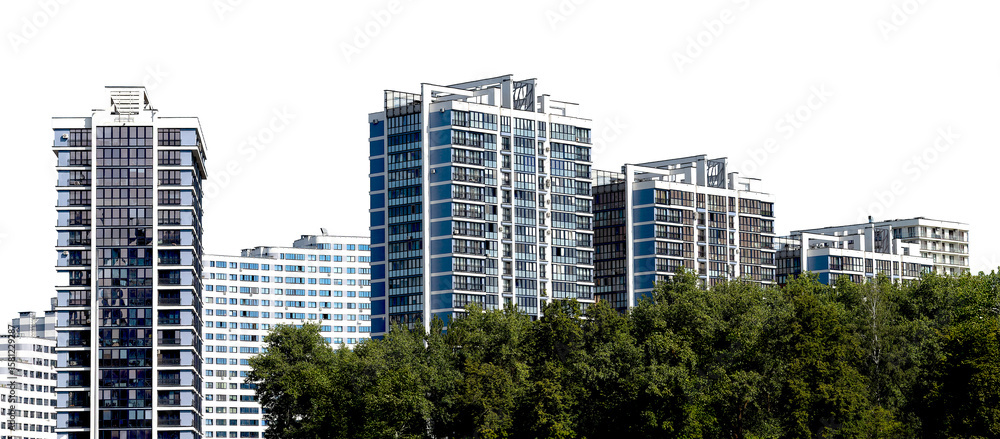 Residential building isolated on white background. Contemporary high rise condo with symmetrical