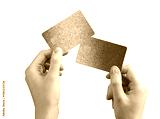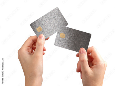 Two bankcards held in hand. Woman showing debit and credit cards with chip for secure payment,